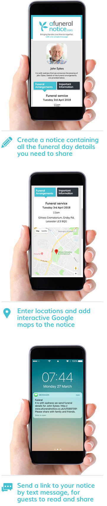 With afuneralnotice.com messages can be sent instantly, direct to the people you choose. It can then be shared amongst family and friends by text message, and even social media if desired - allowing families to avoid the uncertainty of newspaper and online obituaries, and ensuring that everyone who needs to know of the funeral can be informed and pay their respects.